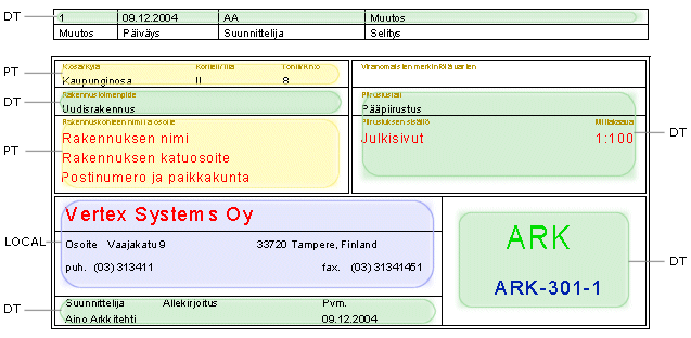 Piirustusarkilla oleva nimiö on määritetty siinä pohjarakennuksessa, jonka pohjalta rakennus on luotu. Pohjarakennus voi olla jokin vanha rakennus tai tyhjä template-rakennus. Nimiössä esitettävät suunnittelutiedot ovat tekstimakroja, joiden sisältö voidaan lukea esimerkiksi seuraavista lähteistä: