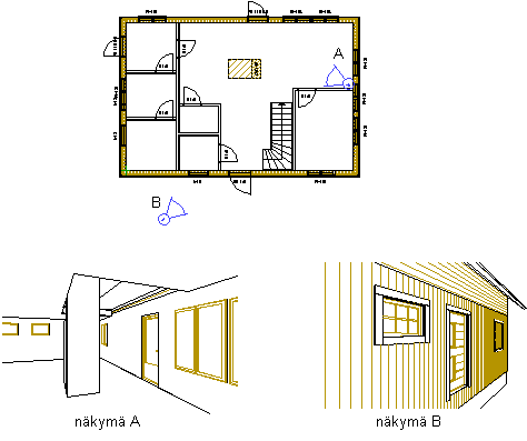 Esimerkissä rakennuksen 2D-piirustukseen on määritetty kaksi perspektiivinäkymää, joiden tunnukset ovat A ja B. Molemmissa perspektiivinäkymissä on katselupisteen korkeusasema 1500 mm, kallistuskulma 0, ja katselukulman laajuus 75 astetta. Perspektiivinäkymille on annettu nimet näkymä A ja näkymä B.