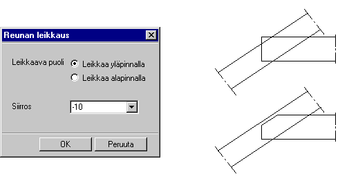 Leikkausparametrit valitaan keskusteluikkunassa. Leikkauspinnaksi voidaan valita joko leikkaavan rakenteen yläpinta tai alapinta. Siirros on leikattavan reunan ja leikkauspinnan välinen erotus. Sen arvo voi olla positiivinen, jolloin reuna ylittää leikkauspinnan, tai negatiivinen, jolloin reunan ja leikkauspinnan välille jää rako. Siirros valitaan luettelosta tai sen arvo syötetään tekstikenttään.