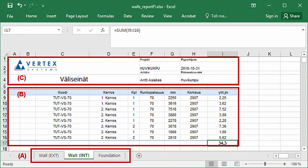 Yksi raporttipohja voi sisältää useita taulukoita (A), joihin voidaan kerätä eri tietoja. Yhteen taulukkoon taas voidaan määrittää useita listauksia (B). Raporttipohjassa voi olla vakiotekstejä, ja siihen voidaan hakea tietoa esimerkiksi rakennuksen tietokannasta tai järjestelmästä (C).