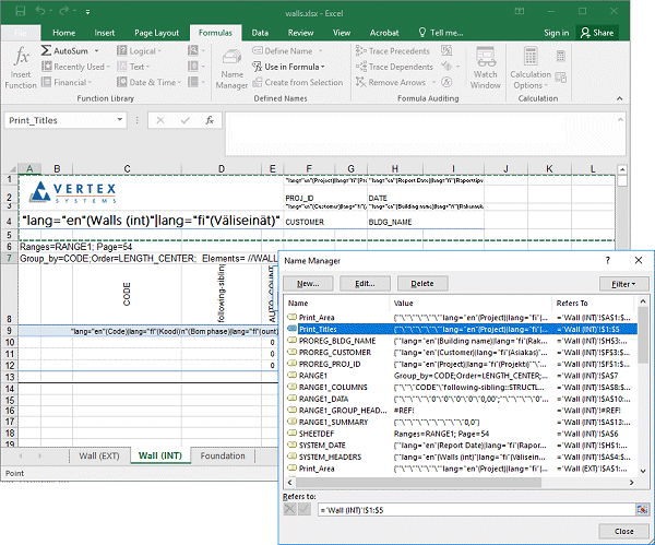 Rakennuksen tietoja voidaan lisätä nimeämällä alue muodossa PROREG_<unique_name>. Nimetyn alueen solujen sisältö haetaan tietokannan kentistä. Esimerkiksi, jos tarvitaan rakennuksen nimi, alueen nimi voi olla PROREG_PROJ_ID, ja solun sisältö PROJ_ID.