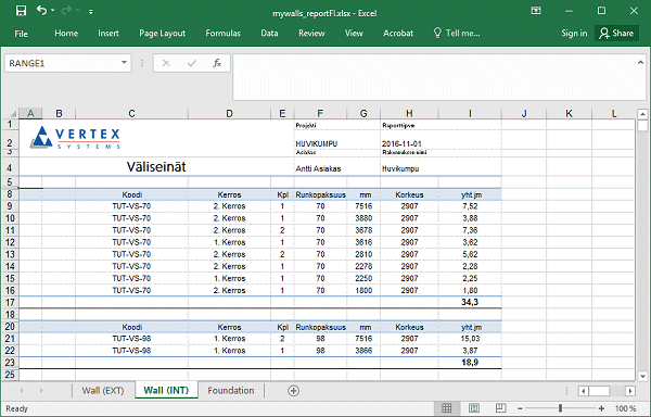 Tietoalueen nimen tulee olla sama kuin taulukon määrittelyalueessa annettu nimi, esimerkiksi RANGE1.