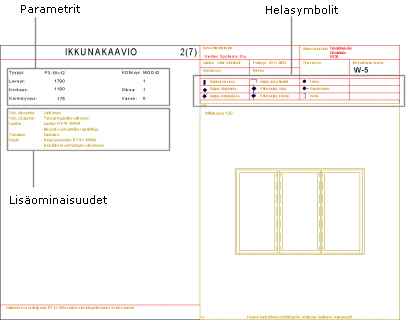 Aukkokaaviot luodaan arkkipohjalle, joka on määritetty asetusarvoissa, katso Ikkuna- ja ovikaavioiden asetukset. Kaaviossa esitetään seuraavat tiedot: