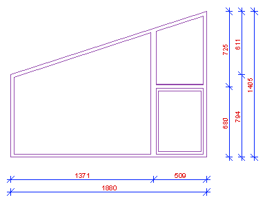 Kun automaattimitoitus on käytössä, ja ikkunoiden ja ovien mallitiedostot sisältävät tarvittavat mittapisteet, ohjelma lisää aukkokaavioon automaattisesti enintään kolme vaaka- ja pystysuoraa mittalinjaa.