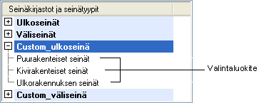 - Valitse seinän tyyppi luettelosta. Tyyppi vaikuttaa seinän käsittelyyn mallissa ja pohjakuvassa, esimerkiksi seinien välisiä liitoksia muodostettaessa tai seiniä elementoitaessa. Tarvittaessa muokkaa myös Valintaluokite tyypin mukaiseksi.