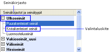 - Hirsiseinän, perustusseinän tai tilanjakoseinän ominaisuuksia ei ole jaettu kerroksittain, vaan valitset ominaisuudet koko seinärakenteelle.