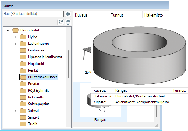 Selvitä ensin, mihin kirjastoon komponentti on tallennettu. Esimerkiksi rakennuskomponenttiselaimesta lisättävän komponentin kirjaston kuvauksen saat selville viemällä kohdistimen komponentin pienoiskuvan päälle.