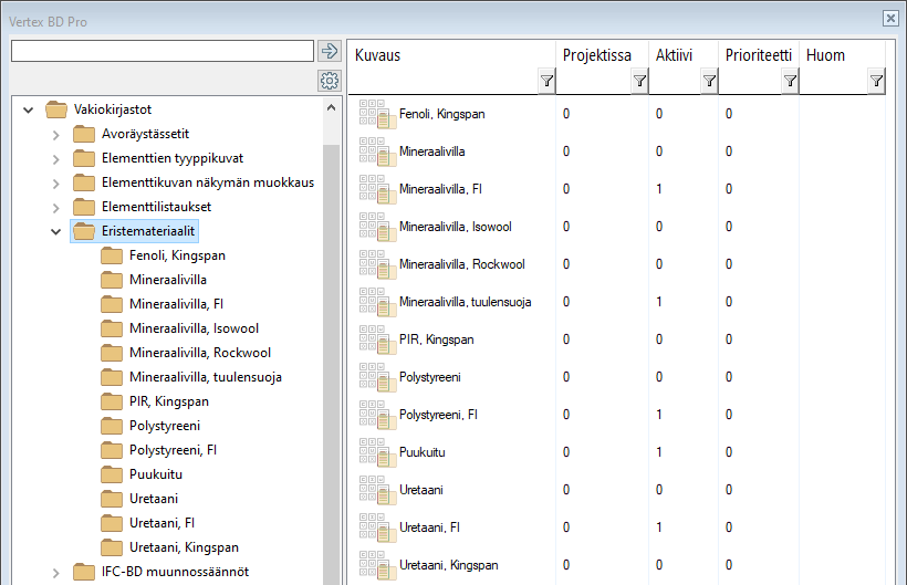 - Rakennusmallin kirjastot - Rakennuskohtaiset kirjastot. Voit tehdä uusia kirjastoja ja lisätä niihin komponentteja. Tunnistat rakennuskohtaisen kirjaston Rakennusmallissa-sarakkeen merkinnästä 1.