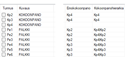 | 20 | Kokoonpanohierarkia | Jos emokokoonpano Kp2 on osa ylemmän tason kokoonpanoa Kp4, hierarkia esitetään sarakkeessa muodossa Kp4|Kp2. |