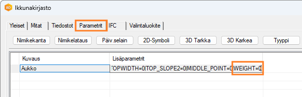 - Jos parametria WINDOW_WEIGHT ei ole määritetty, järjestelmä käyttää parametria OPENING_WEIGHT ikkunoille.