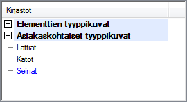 - Käytössäsi voi olla useita kirjastoja. Kirjastoissa komponentit on ryhmitelty valintaluokitteen mukaan. Elementin tyyppikuvan valintaluokite on yleensä elementin tyyppi (katto, lattia, seinä, ristikko). Elementtityypille sopiva valintaluokite on keskusteluikkunassa merkitty sinisellä värillä. Valitse kirjasto ja valintaluokite keskusteluikkunan vasemman yläkulman luetteloruudussa. Tyyppikuvien pienoiskuvat näkyvät luetteloruudun alapuolella.