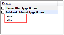 - Tyyppikuvat ryhmitellään kirjastoon valintaluokitteen mukaan. Kirjoita tekstikenttään haluamasi luokite, esimerkiksi elementin tyyppi (seinä, lattia, katto, ristikko).