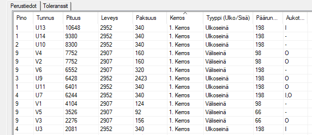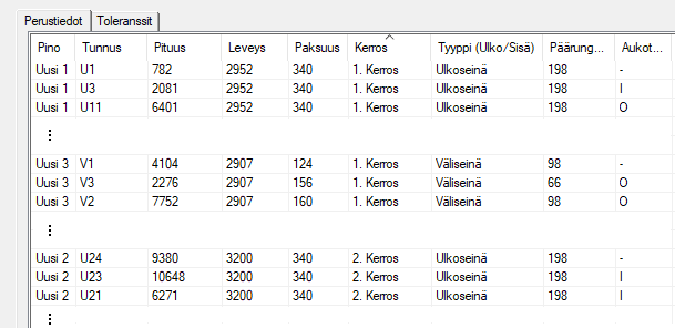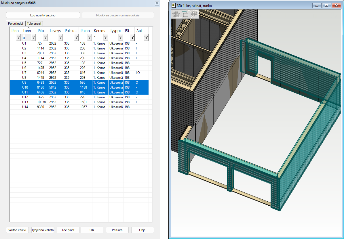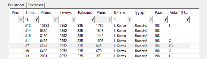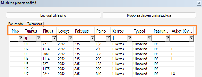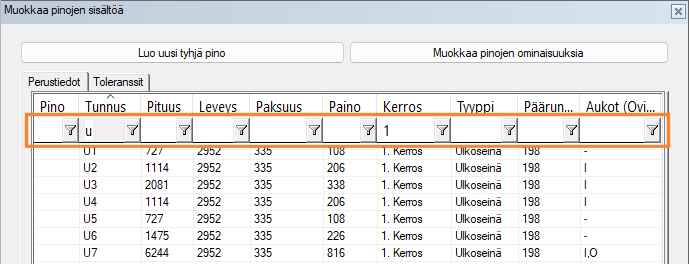 Voit valita elementit, joista pinot muodostetaan joko avoinna olevan kuva-malliparin piirustus- tai malli-ikkunassa tai keskusteluikkunan luettelossa. Luetteloon kerätään kaikki rakennuksen elementit. Elementit, joiden elementtikuva ei ole ajan tasalla, esitetään luettelossa harmaalla pohjalla ja ne eivät ole valittavissa pinoon. Voit rajata luettelossa näytettäviä elementtejä sarakkeiden suodatustoiminnolla.