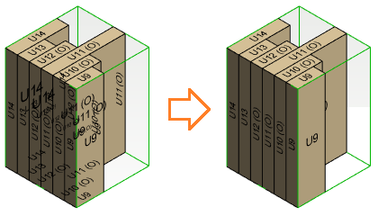 - Pinot > Päivitä koko - Jos pinon ominaisuuksissa on valittu Mitat sisällön perusteella, pinon ääriviivat ovat malli-ikkunassa vihreät. Voit päivittää pinon mitat tilannekohtaisen valikon toiminnolla Päivitä koko, jos siirrät tai poistat elementtejä pinosta.