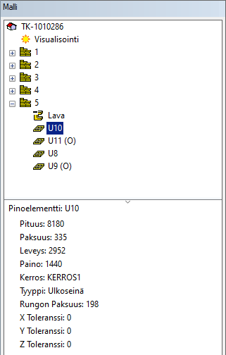 Kun valitset pinosta elementin, sen mitat, paino ja muut tiedot näkyvät mallipuun alaosassa. Jos elementissä on ovia tai ikkunoita, elementin tunnuksen perässä on symboli (O) tai (I).
