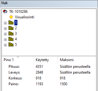 Sarakkeessa Käytetty esitetään pinon nykyiset mitat ja paino. Sarakkeessa Maksimi esitetään pinon ominaisuuksissa asetetut maksimimitat ja mahdollinen painoraja. Merkintä Sisällön perusteella tarkoittaa, että ominaisuuksissa on valittu Mitat sisällön perusteella.