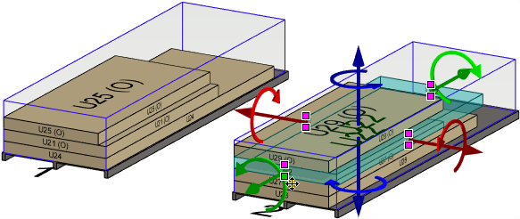 Kun muokkaat pinoja malli-ikkunassa, voit siirtää elementin samassa pinossa tai toiseen pinoon, ja valita sijainnin kohdistuskahvojen avulla. Osoita ensin siirrettävä elementti ja valitse siitä kohdistuskahva. Sen jälkeen osoita toinen elementti ja sen kohdistuskahva. Ensimmäinen elementti siirtyy siten, että kohdistuskahvat yhdistyvät.