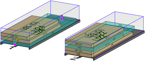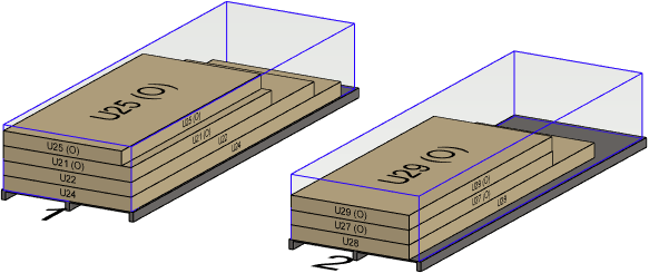 Alla olevassa esimerkissä siirretään pinon 2 elementti U22 pinoon 1 toiseksi alimmaiseksi, elementin U24 yläpuolelle.