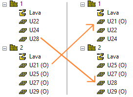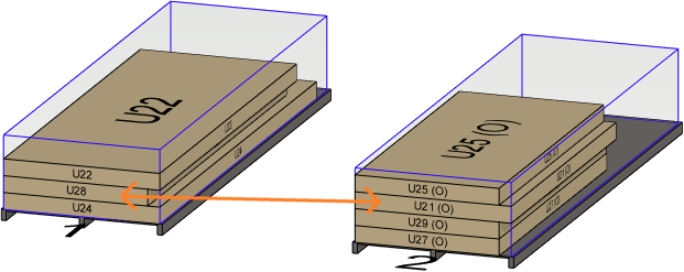 Kun muokkaat pinoa malli-ikkunassa, voit vaihtaa kahden elementin paikkaa keskenään kohdistuskahvojen avulla. Elementit voivat olla samassa pinossa tai eri pinoissa. Alla olevassa esimerkissä vaihdetaan eri pinoissa olevien elementtien U28 ja U21 paikkaa keskenään.