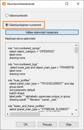 Osanumerointisäännöt on määritetty kirjastossa XML-muodossa. Kun otat sääntöpohjaisen numeroinnin käyttöön rakennuksessa, säännöstö tallentuu rakennukseen sen hetkisessä muodossaan. Jos säännöstöä muokataan, muutokset on päivitettävä rakennukseen valitsemalla säännöstö uudelleen dokumenttiselaimen toiminnolla.