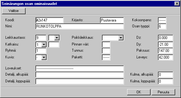 Voit muokata seinäelementin rungon osia täydentämällä tai muokkaamalla niiden ominaisuuksia.