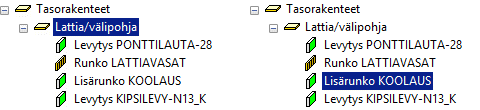 Voit valita koko rakenteen tai halutun kerroksen objektipuussa malli- tai piirustusikkunan ollessa aktiivisena. Voit valita useita rakenteita tai kerroksia Ctrl-näppäin painettuna.