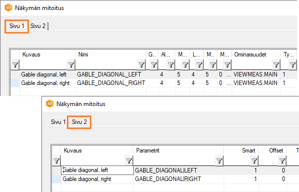 Voit määrittää mittalinjakirjastoon mittalinjan päätykolmioelementin diagonaalimitalle elementin alareunasta harjan korkeimpaan kohtaan. Aseta mittalinjalle lisäparametrit:- GABLE_DIAGONAL|LEFT