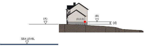 - Rakennuksen korkeus tontista - Anna rakennuksen origon (0,0,0) etäisyys (d) metreinä tontin korkeusasemasta (A).