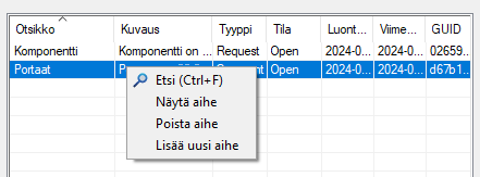 Kun BCF-tiedosto on auki, keskusteluikkunan luettelossa näkyvät tiedoston aiheet. Voit avata aiheen tiedot, poistaa aiheen tai lisätä uuden aiheen tilannekohtaisen valikon toiminnoilla.