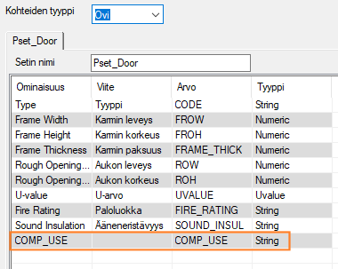 - Lisää ovelle COMP_USE-luokite PÄÄOVI.
