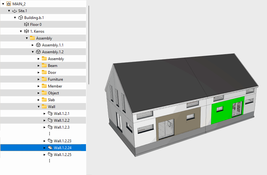 - Alimallissa on objekteja 1. ja 2. kerroksessa. Se lisätään päämallissa 2. kerrokseen. Päämalli viedään IFC-tiedostoon. IFC-mallissa alimallin objektit ovat 2. ja 3. kerroksessa.