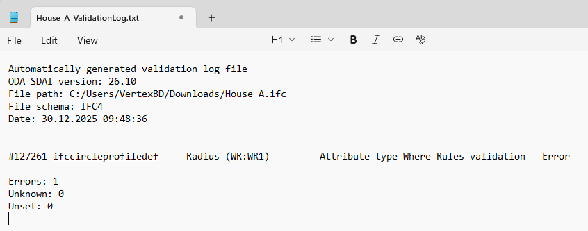 Validoinnin tulokset avautuvat erilliseen ikkunaan, jossa näytetään mahdollisten virheiden lukumäärä. Tarkemmat tiedot virheistä kerätään lokitiedostoon [IFC-tiedoston nimi]_ValidationLog.txt, joka muodostuu samaan kansioon kuin alkuperäinen IFC-tiedosto. Voit avata kansion napsauttamalla Avaa kansio. Voit avata kansiossa olevan tekstitiedoston millä tahansa tekstieditorilla.