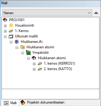 IFC-malli näkyy IFC-tiedoston mukaisena rakenteena objektipuussa omassa haarassaan. Voit piilottaa osia, joita et halua nähdä. Voit myös valita mallista samantyyppisiä osia.