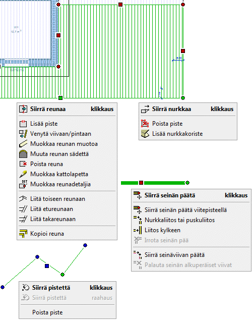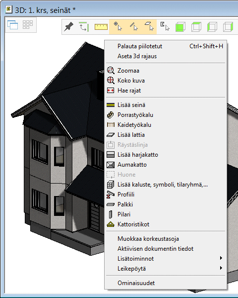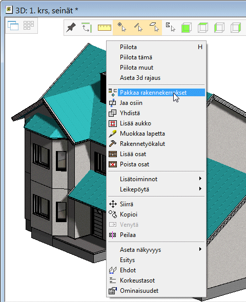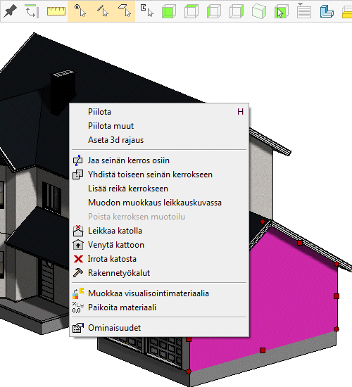 Kun muotoilet kerroksellista rakennetta (seinä, lattia, katto tai yläpohja), valitse ensin rakenne ja sen jälkeen kerros. Huomaa valitun objektin merkintä eri väreillä. Avaa tilannekohtainen valikko hiiren oikealla painikkeella, ja valitse toiminto valikosta.