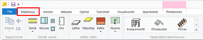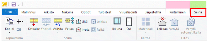 Tilannekohtainen välilehti avautuu, kun valittuna on jokin objekti, esimerkiksi Seinä tai Tasorakenne.