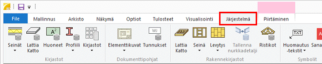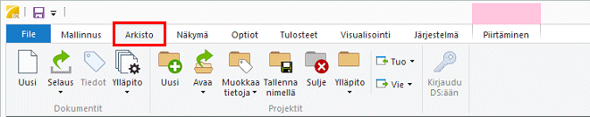 Rakennukseen liittyvät toiminnot ovatArkisto -välilehdellä. Rakennuksen avaus, sulkeminen ja tallennus löytyvät myös Tiedosto -valikosta.
