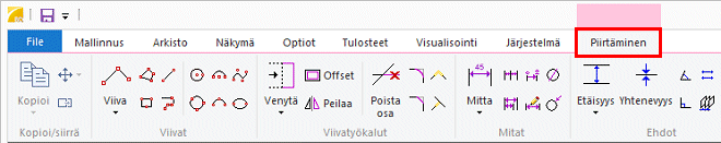 Viivat, mitat, tekstit ja kuviot löytyvät Piirtäminen -välilehdeltä.