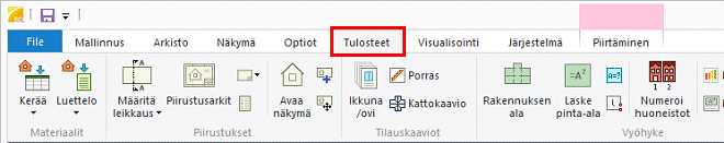 Materiaaliluetteloihin, piirustuksiin ja muihin mallista tuotettuihin dokumentteihin liittyvät toiminnot löytyvät Tulosteet -välilehdeltä.