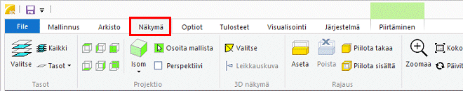 Näkymä -välilehdeltä löytyvät piirustuksen ja mallin tarkasteluun liittyvät toiminnot sekä ikkunoiden hallinnan toiminnot. Osa toiminnoista on valittavissa myös työikkunan yläreunan työkalunauhassa.