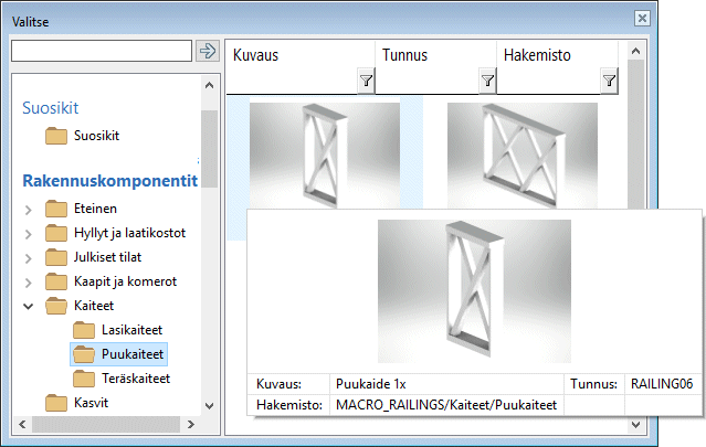 Selainta käytetään erilaisten kirjastojen kuten ikkuna-, ovi-, rakennuskomponentti- ja liitoskirjastojen selaukseen ja niissä olevien komponenttien lisäämiseen piirustukseen tai malliin.