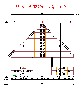 Avaa seinän hirsikuva katselua ja tulostusta varten erilliseen piirustusikkunaan. Hirsikuvassa esitetään seinän yhdensuuntaisprojektion lisäksi muun muassa otsikkoteksti, hirsien tunnukset, seinän mitat ja työstöt. Voit avata samaan piirustusikkunaan useita hirsikuvia. Toiminto on käytettävissä pohjakuvassa.