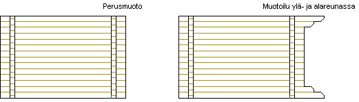 Lisää päätymuoto sekä seinän ylä- että alareunaan. Asetusarvotiedostossa on määritetty kuinka monen ylä- ja alareunan hirren pää muotoillaan ja miten. Välissä olevien hirsien päät jäävät ennalleen.