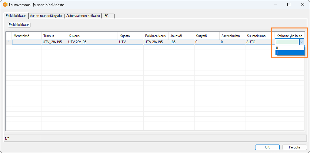 Päivitystoiminto lisää asiakaskohtaisen lautaverhoustyökalukirjaston tietokantaan FRMTOOL_CLADDING kentän CUT_TOP_BOARD.