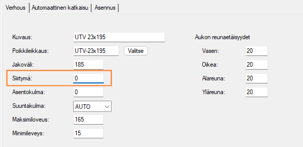 Versiossa 2025 (31.0) on mahdollista käyttää rungon oletuskohdistusta myös pystyverhouksen kohdistamiseen. Päivitystoiminto lisää asiakaskohtaisen lautaverhoustyökalukirjaston tietokantaan (FRMTOOL_CLADDING) kentän, jolla voidaan määrittää aloituspisteelle siirtymä rungon oletuskohdistuksen aloituspisteestä.