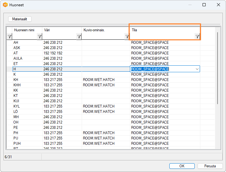 Päivitystoiminto lisää asiakaskohtaisen huonekirjaston tietokantaan ROOMS kentän SPACE. Kenttään on mahdollista määrittää huoneelle oletustila. Tila valitaan tilakirjastosta.