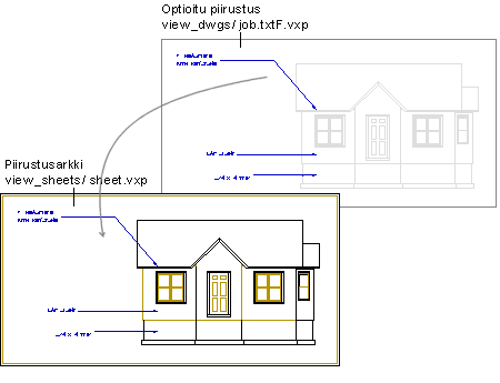 Optioitu piirustus job.txtF.vxp luetaan julkisivupiirustusarkille alipiirustuksena view_dwgs -kansiosta.