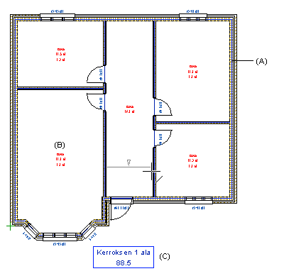 Kun lisäät seiniä, seinien keskiviivat (A) pohjakuvassa ovat merkkinä siitä, että asetus Assosiatiiviset seinät on käytössä.
