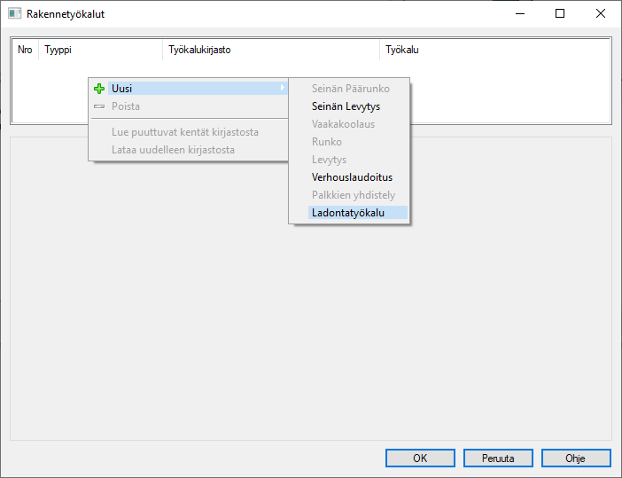 Voit lisätä ladontatyökalun rakenteen pinta- tai verhouskerrokselle. Rakenne voi olla elementti (seinä-, lattia- tai katto-) tai vaakarakenne kerrokset laajennettuina. Lisää ladontatyökalu kerrokselle samalla tavalla kuin muutkin rakennetyökalut, katso Rakennetyökalut.