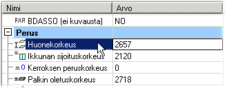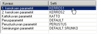 - Luettelossa näkyvät perusparametrien ja seinärungon parametrien lisäksi rakennuksen