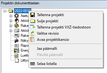 Voit valita rakennuksen hallintaan liittyviä toimintoja ja asetuksia rakennuksen dokumenttiselaimesta.